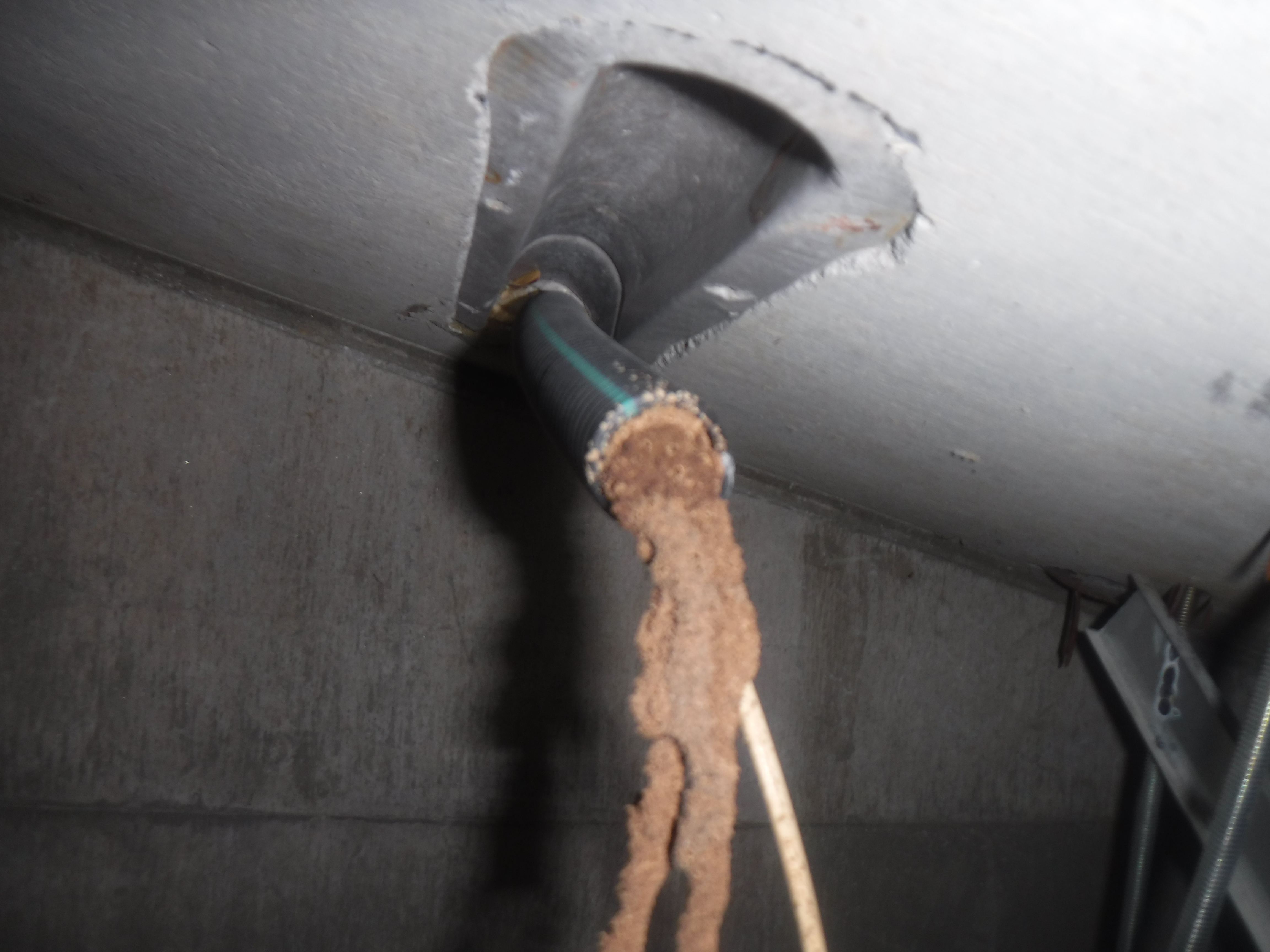 イエシロアリは、ヤマトシロアリと同じく地下シロアリ類となるため、土壌内から侵入してくる経路が主ですが、下記写真のように配線の隙間などから侵入してくることもあります(@ ̄□ ̄@;)!!